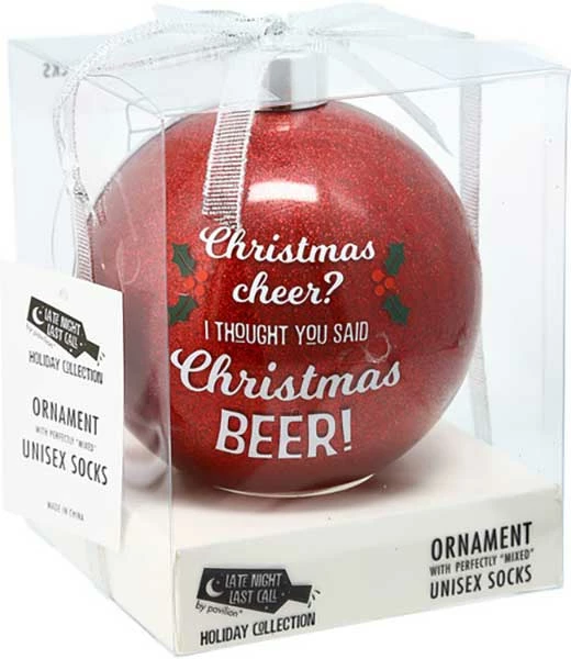 Enjoy Christmas Cheer with these fun Christmas Beer socks with a 4″ ornament. The unisex socks have the slogan on the soles and beer glasses and steins on the upper. 4″ plastic ornament has text decal and beer glass imagery. Perfect for Christmas gifting to a friend or yourself!