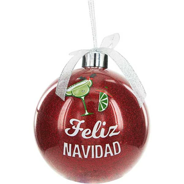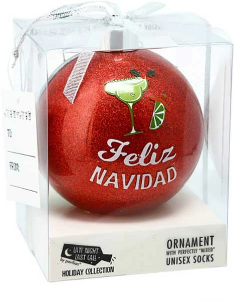 These Feliz Navidad socks with a 4″ ornament make a great gift for you or a loved one. The unisex socks have the slogan on the soles and margarita glasses on the upper. 4″ plastic ornament has text decal and imagery. Perfect for Christmas gifting to a friend or yourself!