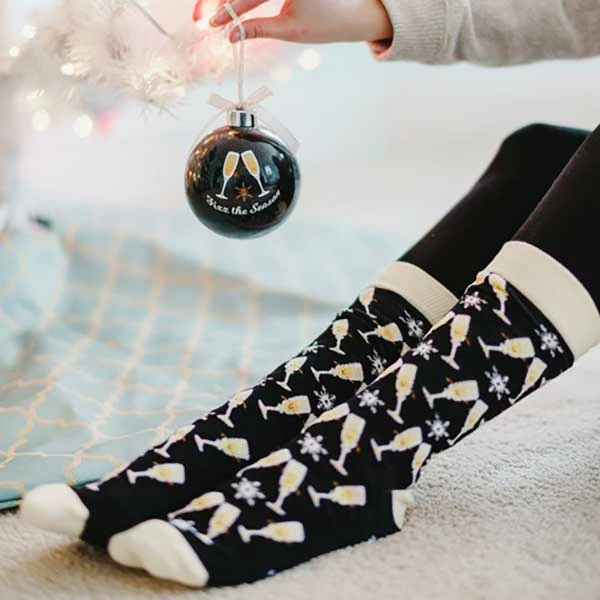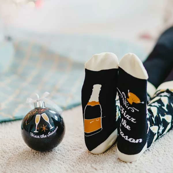 Have some fun with these Fizz The Season socks with a 4″ ornament. The unisex socks have the slogan on the soles and champagne glasses and snowflakes on the upper. 4″ plastic ornament has text decal and alcohol imagery. Perfect for Christmas gifting to a friend or yourself!