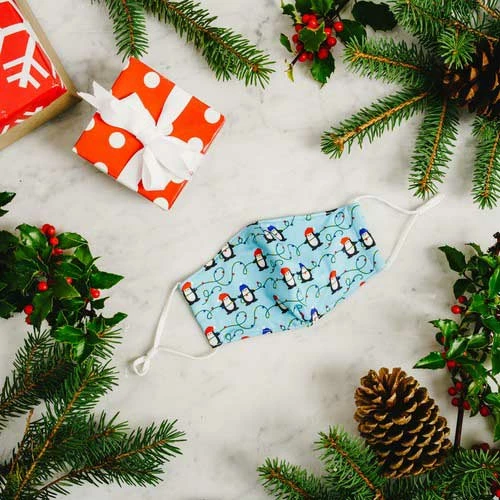 The Penguin & Lights kid’s face mask will add a festive spirit to the Holiday Season with the Penguins wearing caps stringing Christmas lights. The reusable 2-layer 100% cotton mask also has a filter pocket (not included). The ear loops are 55% nylon and 45% elastane and feature rubber stoppers to adjust the fit. Recommended for ages 6 and up.