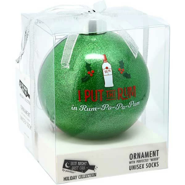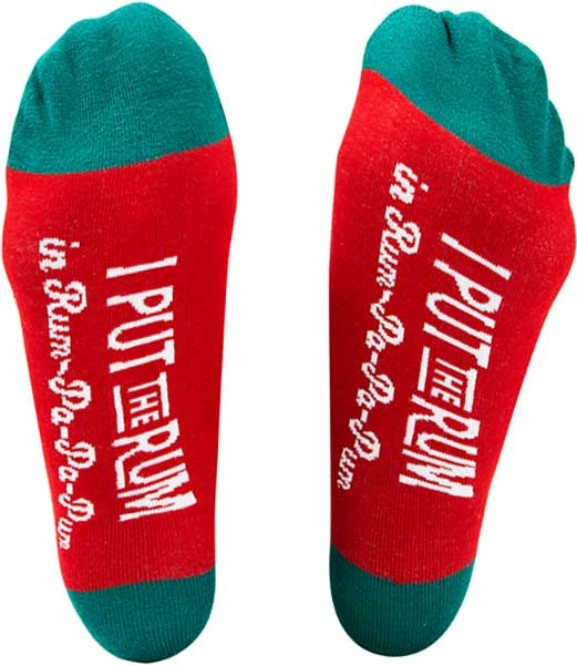 Have some fun with these Rum-Pa-Pa-Pum socks with a 4″ ornament. The unisex socks have the slogan on the soles and rum bottles and holly on the upper. 4″ plastic ornament has text decal and alcohol imagery. Perfect for Christmas gifting to a friend or yourself!