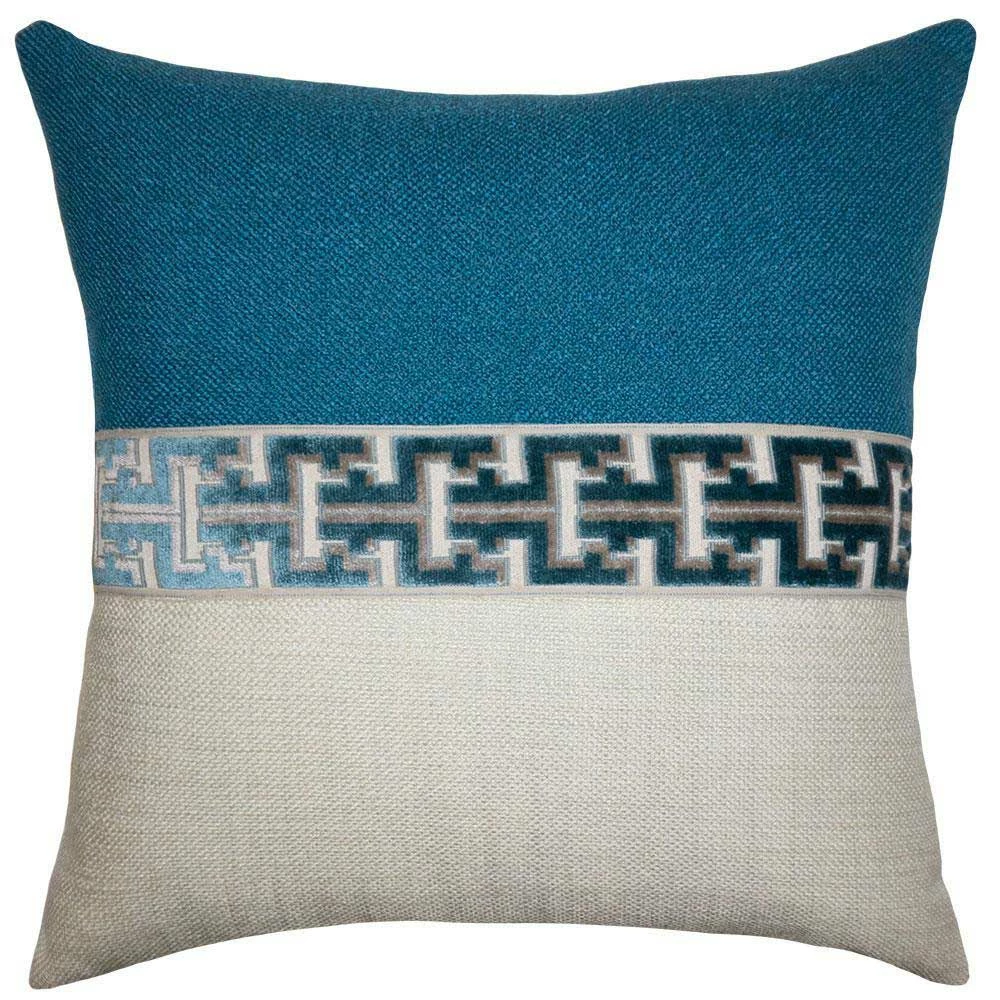 The Jager Atlantic Throw Pillow in blue and off-white is accentuated with the complementing raised geometric pattern for visual and tactile appeal. Mix and match with other Jager pillows to add color and dimension to your living space. Madeto order in Texas.