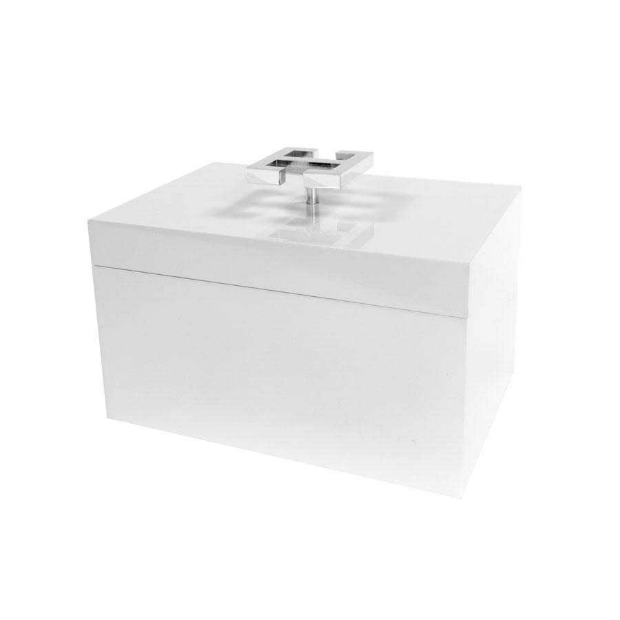The White Lacquered Box – Chrome Greek Handle is jewelry for your table. This box will dress up any table or console in your entryway or living area, adding a touch of style and upscale class, all while being functional. An ideal way to keep things fashionably handy and in their place. Available in two sizes. Made to order in Texas.