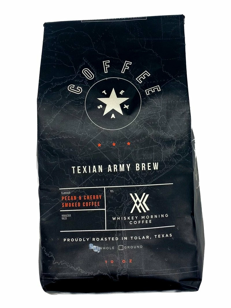 Start your day with bold flavor in a great tasting fresh brewed coffee. The Texian Army Brew Coffee is fire-roasted with pecan then finished with the cold wood smoke of cherry for delicious flavor. It’s great for entertaining your dinner guests or enjoying with friends and family gathered around the fire-pit on a chilly evening. Available in Ground or Whole Bean. Imported beans fresh roasted locally in Texas.