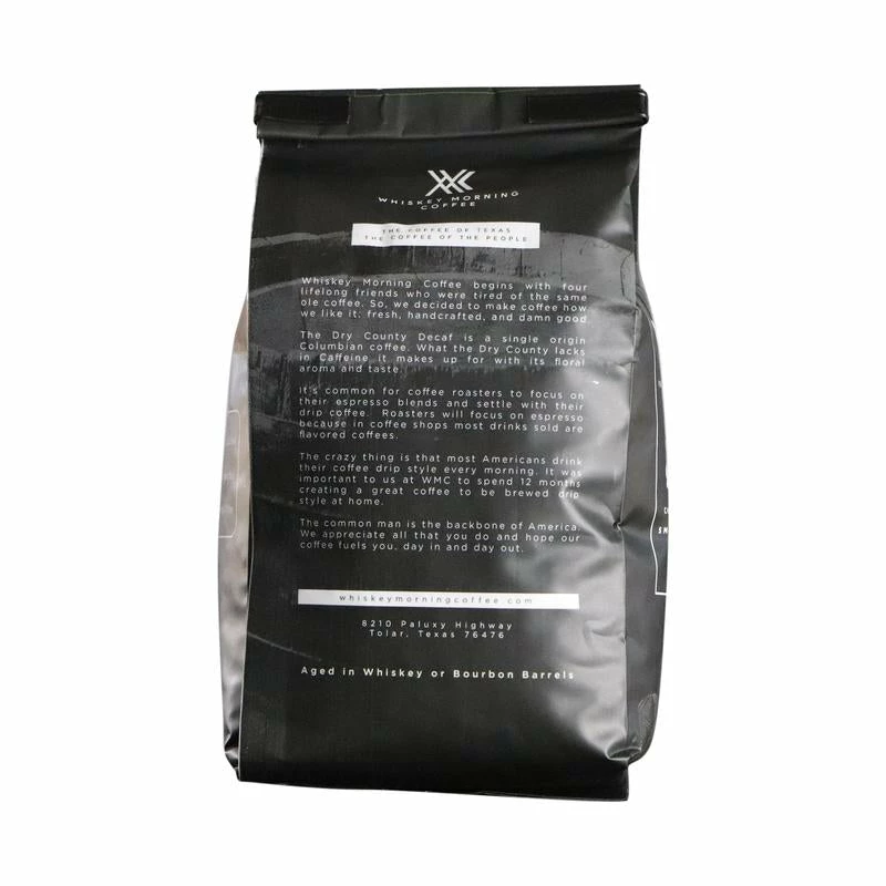 What better way is there to enjoy an afternoon coffee or wow your dinner guests than with a great tasting fresh brewed decaf coffee? This Dry County Decaf Coffee is it! The high quality Colombian coffee beans are aged in fresh whiskey and bourbon barrels to produce a blend rich with a bourbon aroma and sweet oak tones then fire-roasted to a medium roast. All natural, no alcohol or artificial flavors. Available in Ground or Whole Bean. Imported beans fresh roasted in Texas.