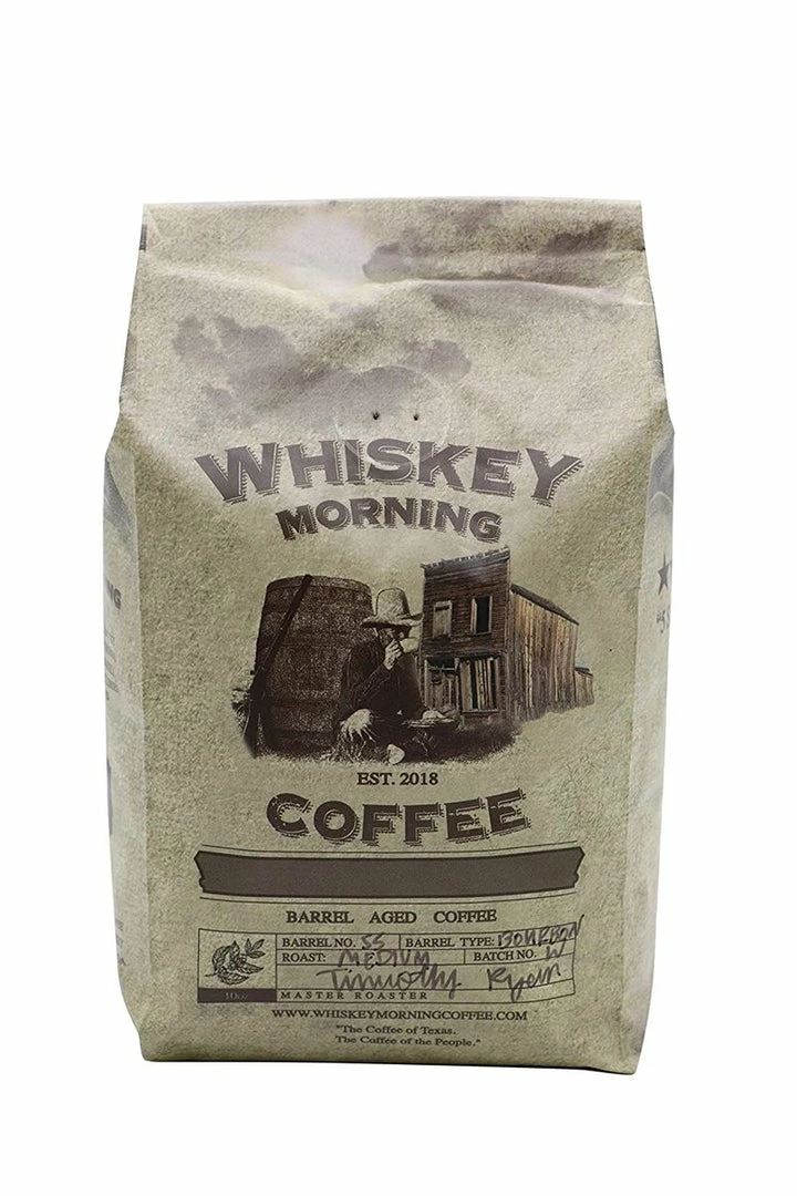 Aged in fresh whiskey and bourbon barrels to produce a blend rich with a bourbon aroma and sweet oak tones, the high quality coffee beans are then fire-roasted to a medium roast. All natural with no alcohol or artificial flavors added. Available in Ground or Whole Bean, the imported beans are aged, blended, and fresh roasted locally in Texas.
