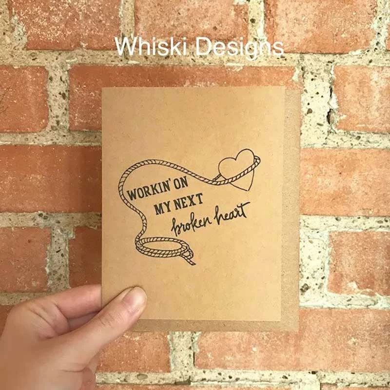 The Workin’ On My Next Broken Heart Greeting Card has just the right amount of sass to go with the original graphic design. Perfect to send to your BFF or next hopeful romance. The card is blank on the inside so you can add your own message. Matching envelope included. Made in Texas.