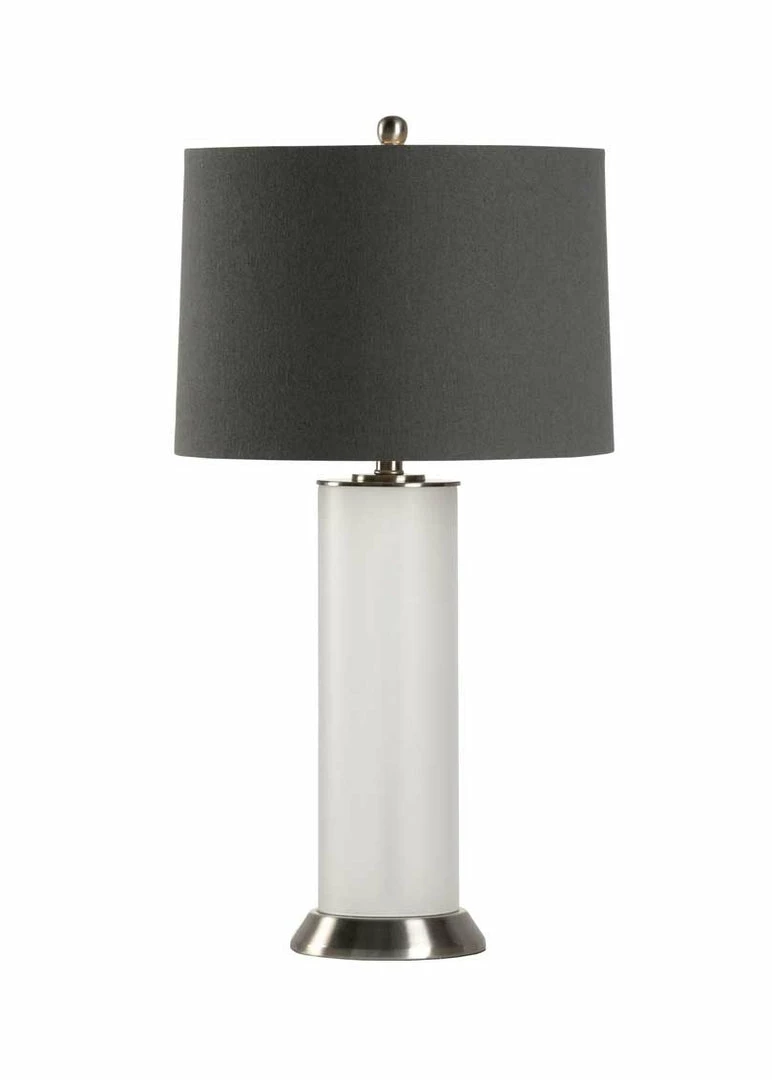 Look no further for the perfect table lamp for your industrial-style loft living room or bedroom lighting decor. A frosted glass cylinder with brushed nickel base and black shade is the modern look. Place alone on a steel and glass side table or grab a pair to frame your statement sofa piece.