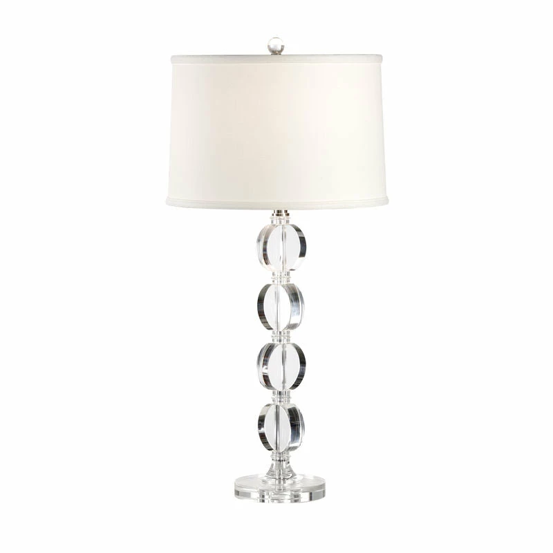The Arden Lamp has solid crystal discs forming the stem for this elegant lamp. Trimmed with nickel accents and an off-white linen shade.