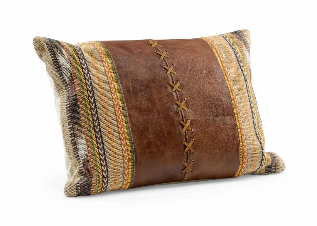 Accent your leather sofas or chairs with this Southwest accent leather and fabric pillow. The mix of warm earth tone hues and leather give this a comfortable and relaxed look to your rustic decor. Hand loomed tapestry fabric with tan leather center and lacing.
