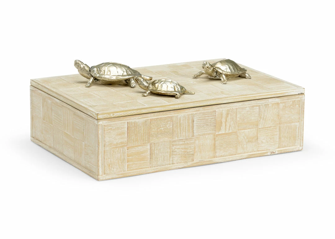 Tortoise Family Box in a wood grain pattern with white washed driftwood finish. Adorned with three silver plated composite turtles. Ideal for use on a dresser, as an organizer for the office desk, or to store the TV remotes on the coffee table.