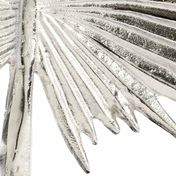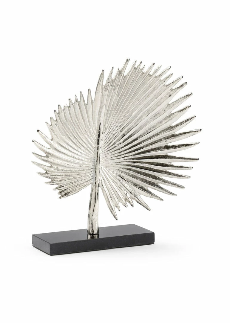 A cast aluminum fan palm with silver finish on a black marble mounting.