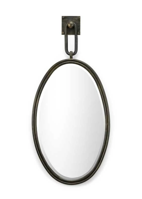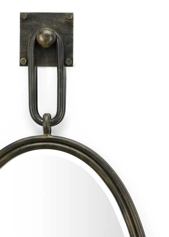 Open up your space while adding style with the Tobago Mirror. This large oval mirror features an antiqued bronze finish on an iron frame. The modern contemporary design is suspended from a square wall hook for added dimension. Worthy of its own space, mount this beveled mirror on a wall in your home to reflect your decorative aesthetic.