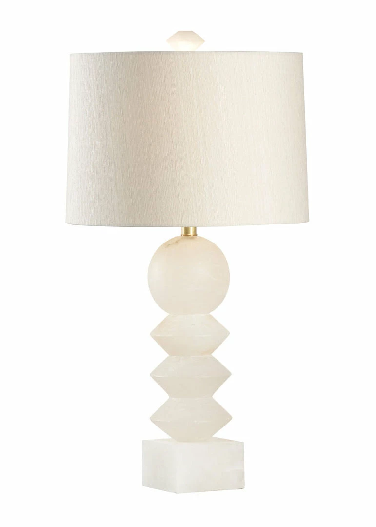 A natural white alabaster body with antique brass finished mounting. The accompanying shade is raw silk in Cream. A 100W maximum bulb is recommended with the 3-way switch.